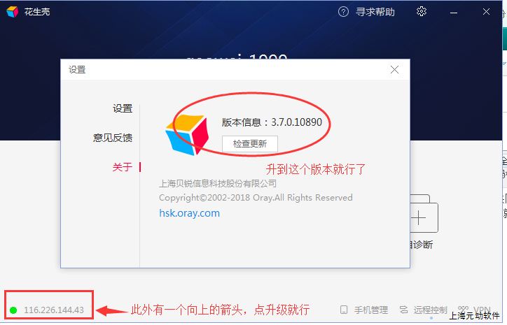 最近接连接到三个客户反应元动系统无法登陆,或者登陆后反应特别慢电话。检查内网访问,从局域网分机ping主机都没有问题,只有外网无法访问,三个用户都有一个共同的特点都是用的花生壳映射外网,发现用户都是商业版,不是免费版,通过ping 域名,发现域名掉包。后通过花生壳官网发现花生壳有新的版本,然后升级到3.7.01版本,问题就解决了,升级方法如下: 1、直接在花生壳客户端上点升级,可以升级到最新的版本。