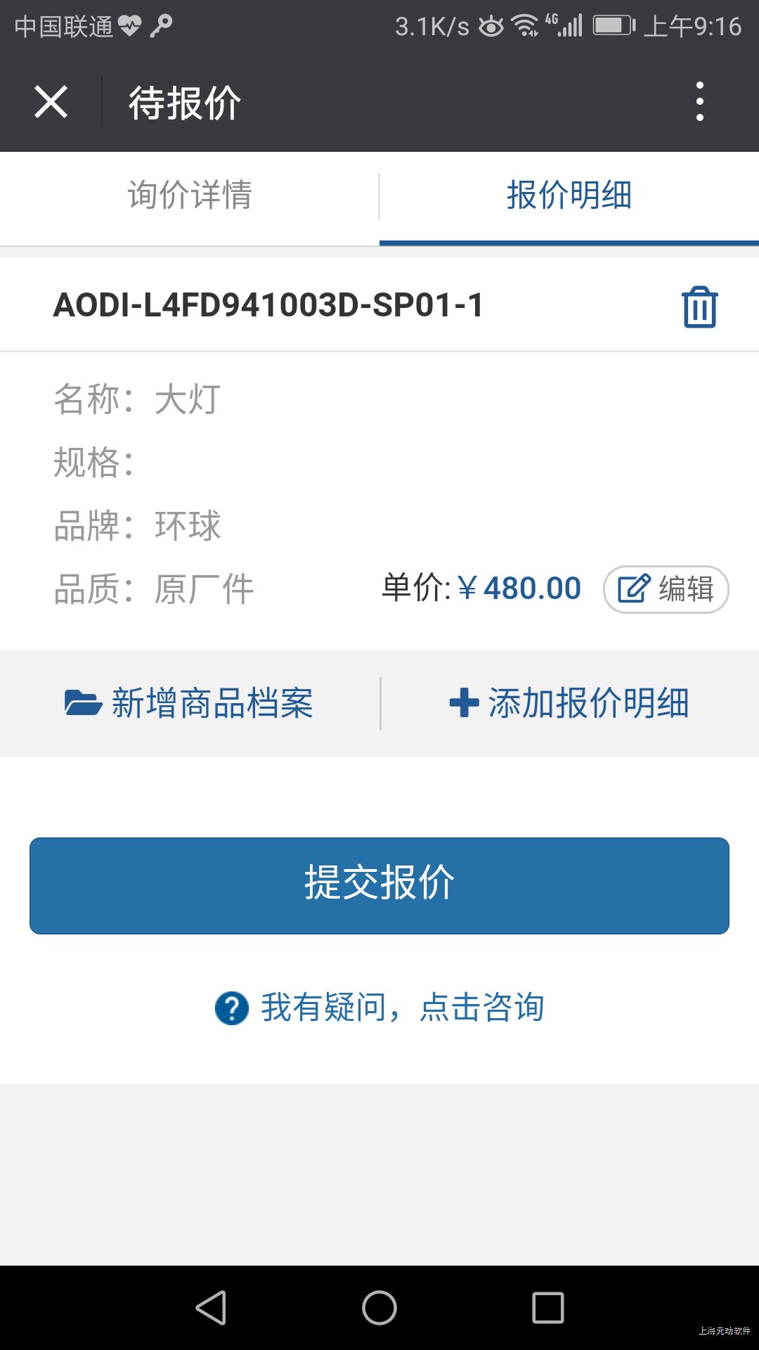 二、打开询价单的信息,点击新增加商品档案,并提交报价。