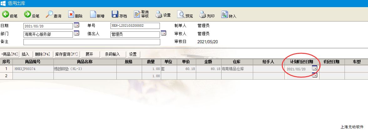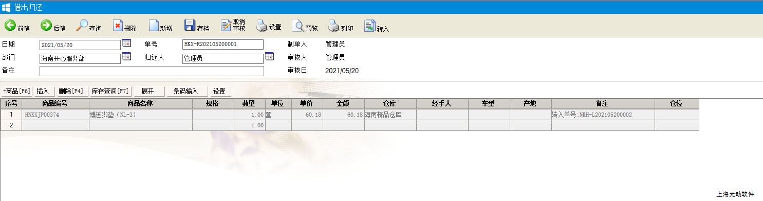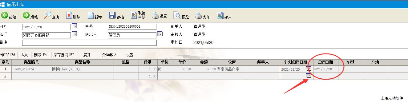 4、成功归还的商品会自动记录归还日期到借用出库明细中。