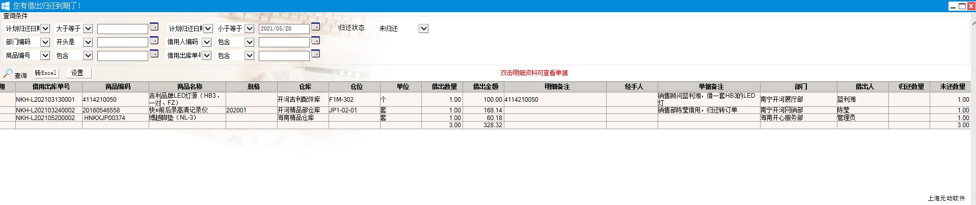 2、到期后在系统登录桌面的每日提醒中可以查看到提醒归还的明细记录。