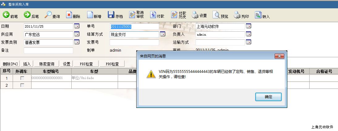 这个时候我们去修改采购入库单时,系统会提示“此车已做了销售或订购等相关操作”(如下图1)