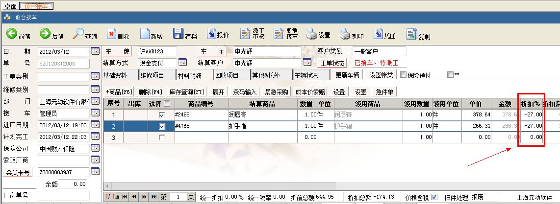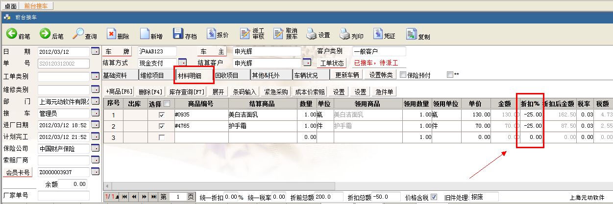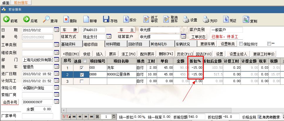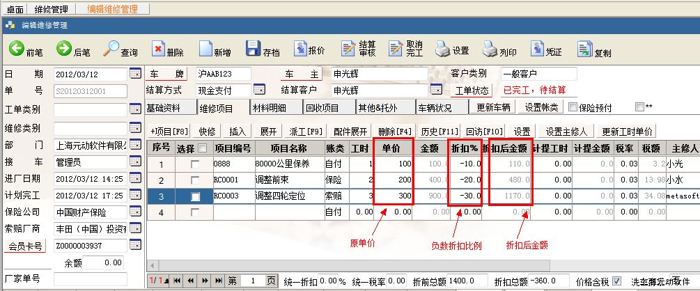 2、手工输入的负折扣在维修工单中的应用,如下图