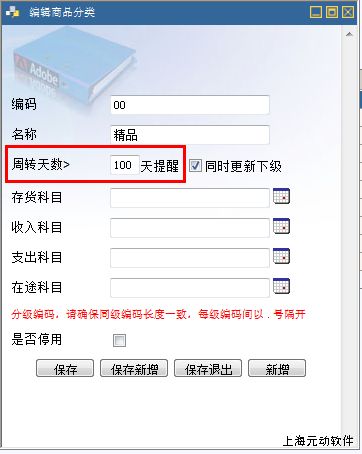 四、存货周转天数在元动中的操作1、在“基本资料--商品字典--商品分类”中设置周转提醒天数,如下图