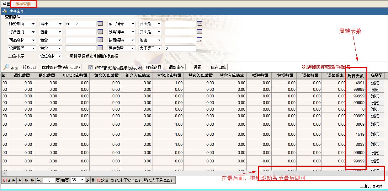 4、在库存查询中,也增加了库存周转天数的显示列