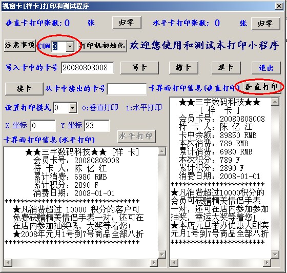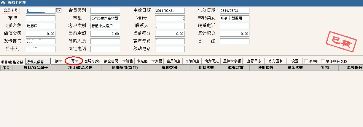8.打开会员管理->卡管理,双击卡一张卡,点击写卡,弹出确认窗口,点击确定,如果打印成功,则可是卡设置完成!不成功,检查错误,重新设置!