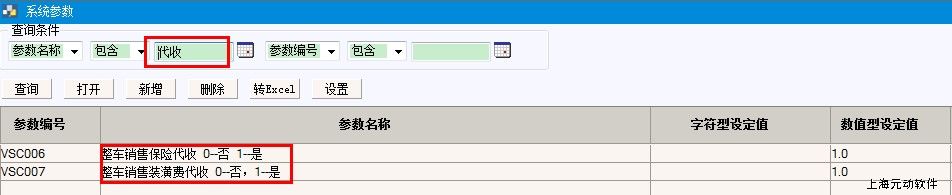一、首先,在系统参数中输入‘代收’查询到VSC006和VSC007两项参数