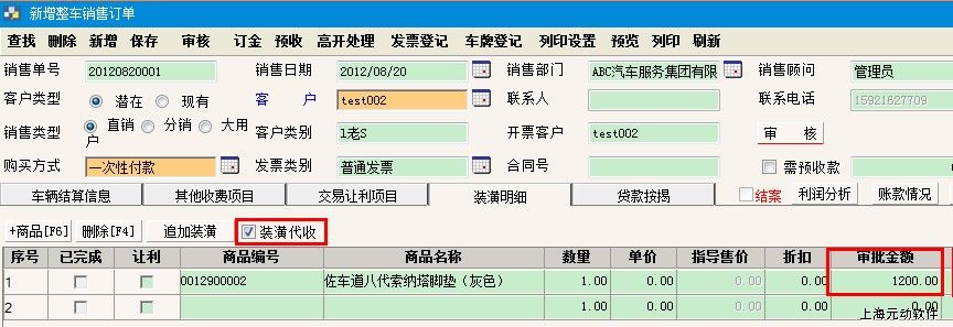 二、 整车销售订单界面,也相应增加了两个栏位,分别是保险代收、装潢代收,新增单据时这两个栏按对应的系统参数默认,亦可修改。