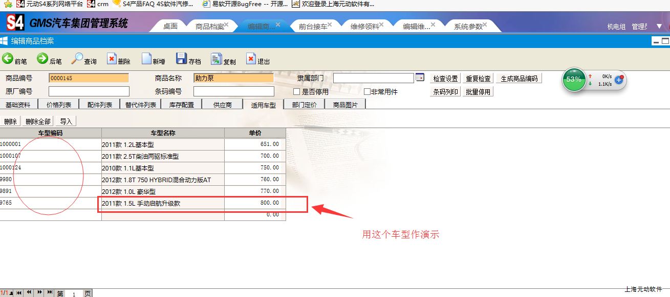 一、在商品档案中先定义好配件的适用车型及价格,如下图: