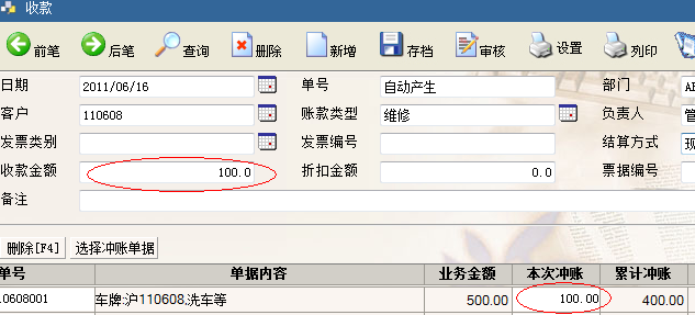 点击收款按钮后,操作人员可见本次冲账栏位值为“100”;此时,我们输入收款100,