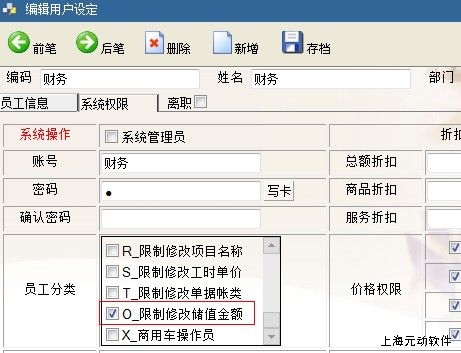 解决方案:造成以上情况,原因是:在用户系统权限——员工分类,勾选了“限制修改储值金额”;