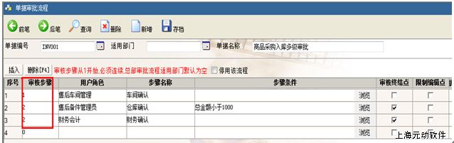 系统管理-单据审批流程,选择相应的单据,设置审批步骤的先后顺序和判断条件以及终结点,例如:商品采购入库首先需要车间人员做出采购确认审核,然后由仓库人员做入库审核