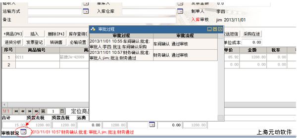 如果该单据的采购总金额超过1000元,则提示超出仓库的审批范围,这时需要由财务会计人员做最终的入库审核