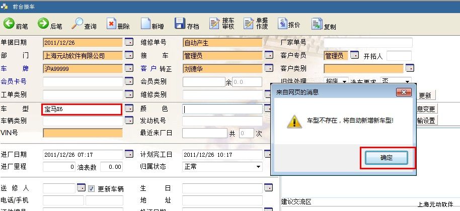 即可手动输入车型,如不存在,系统将提示,点击“确定”,即自动回写到车型档案;