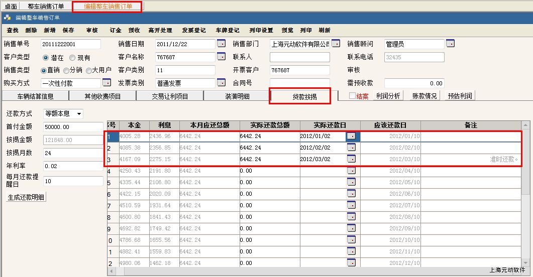 完成车辆结算信息、其他收费项目、交易让利项目、装潢明细的编辑后,开始操作“贷款按揭”,