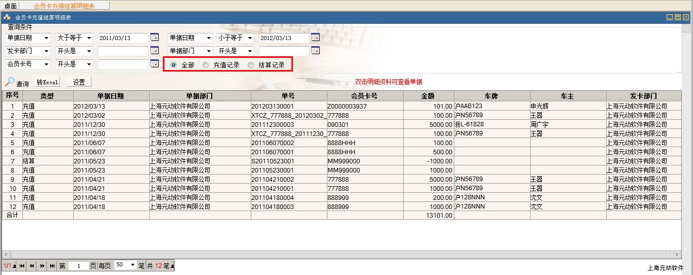 会员卡充值结算明细表”,用于管理金额的充值和消费,报表界面如下图: