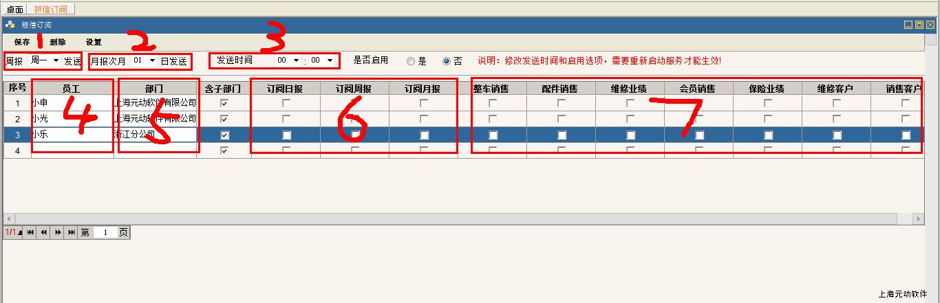 注意: 1)在“短信平台--短信订阅”界面上启用短信订阅功能; 2)修改发送时间和启用选项,需要重新启动服务才能生效。