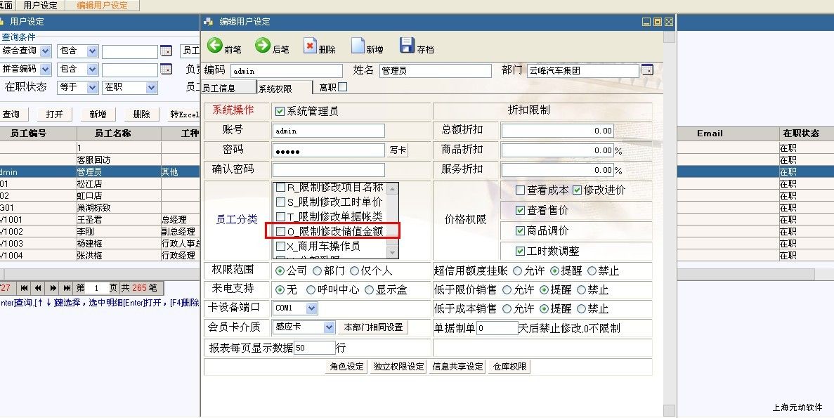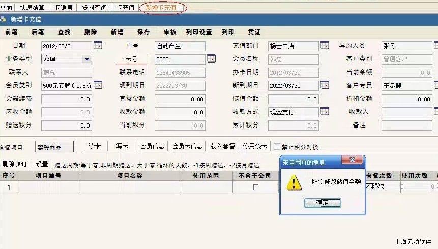在卡充值当中修改储值金额栏位,提示限制修改储值金额。