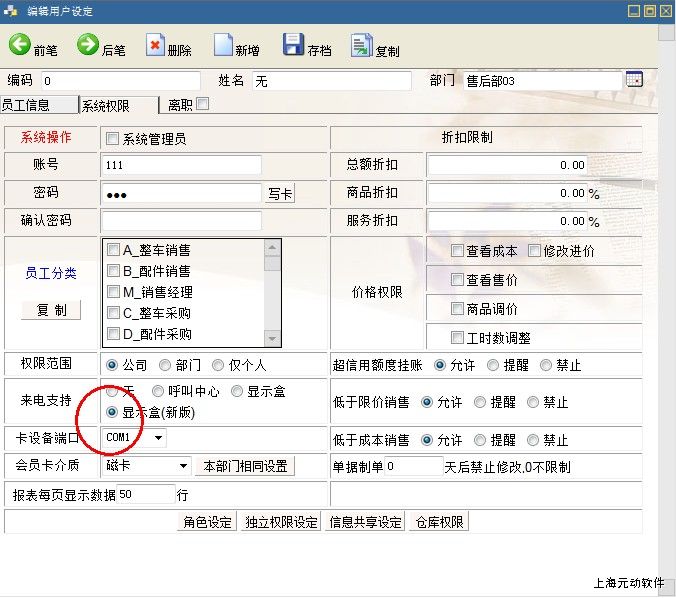 登录元动S4系统,进入“系统管理-用户设定”,打开使用来电