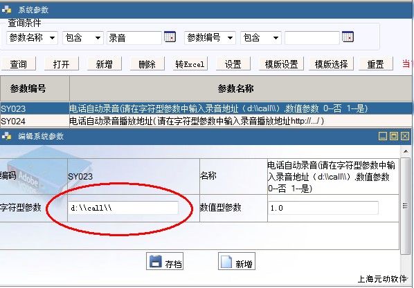 双击打开“SY023”参数,数值型参数输入“1”,表示来电时自动录音;