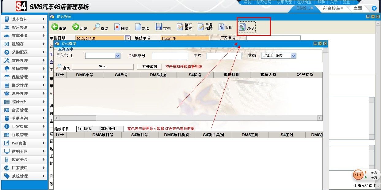1)功能入口在【前台接车】界面有DMS按钮,如下图所示: