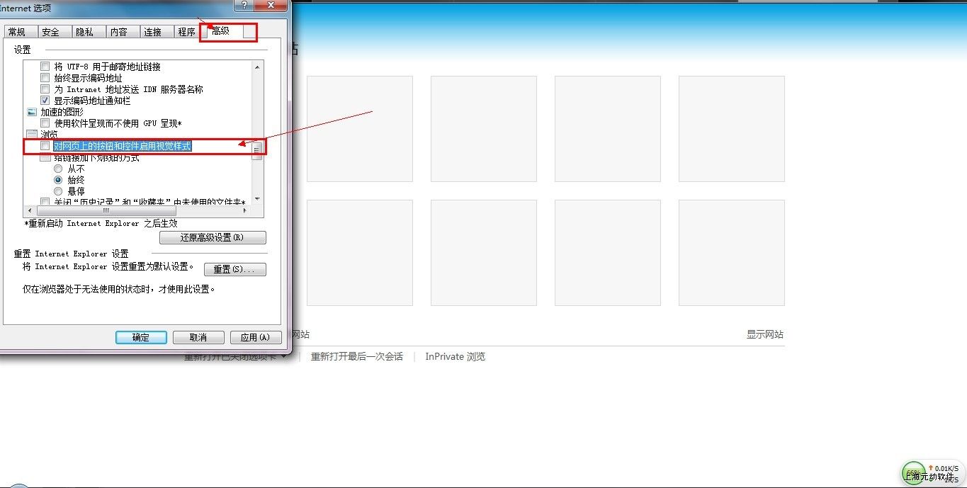 二,打开IE,点击IE上面的 工具 - 打开internet选项 - 点击选项卡 ”高级“,在设置框里面查找”浏览“选项里面的”对网页上的按钮或控件启用视觉样式“的勾给去掉