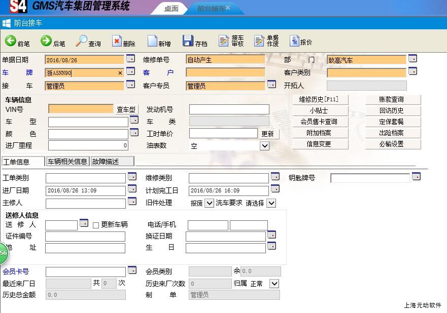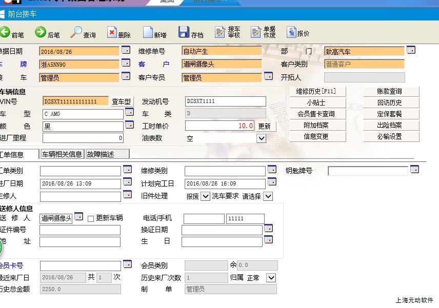 可以看到,车牌处自动带入识别的车牌,继续添加其他客户信息进行正常接车;