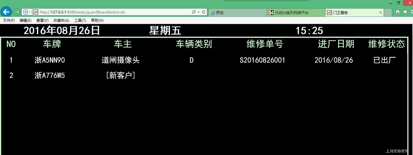 1、门卫看板:维修管理---透明车间---车牌识别看板---门卫看板,当有车辆进入时,门卫看板则会显示车辆状态如下图所示