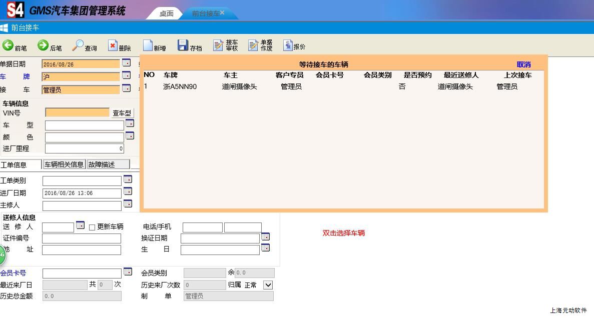 双击此车辆返回接车界面,系统根据识别出的车牌会自动带出所有客户资料,如下图: