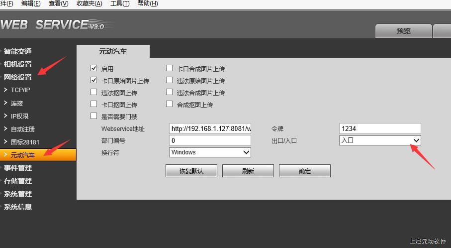 登录元动软件---系统管理----系统设置---系统参数:启用外部参数接口,参数编号为IF001,数值参数1,字符参数为外部接口令牌,这个在摄像头设置的时候需要用到,需要记下来。例如:本次测试中,设置为1234。
