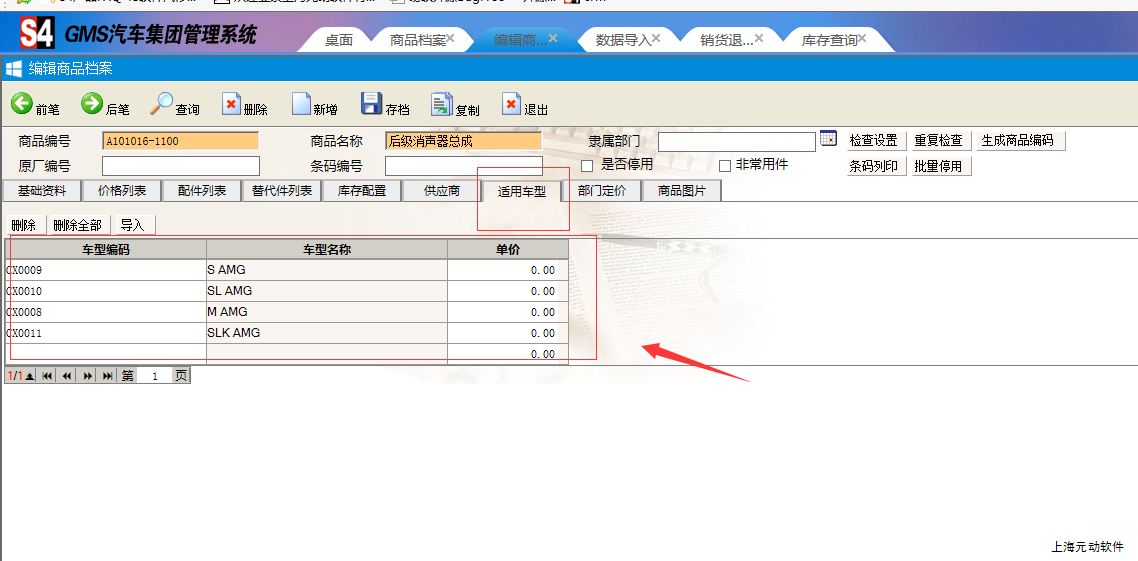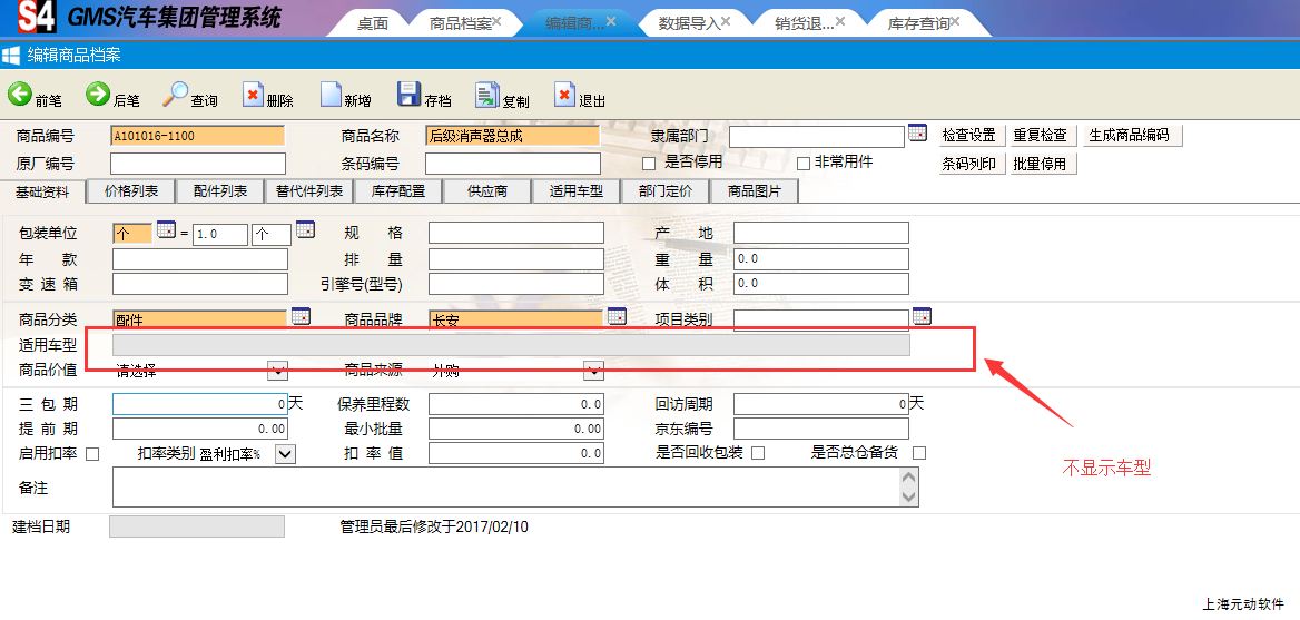 二、商品档案页面上面列表中有适用车型、但基础资料的适用车型没有显示出来。如下图