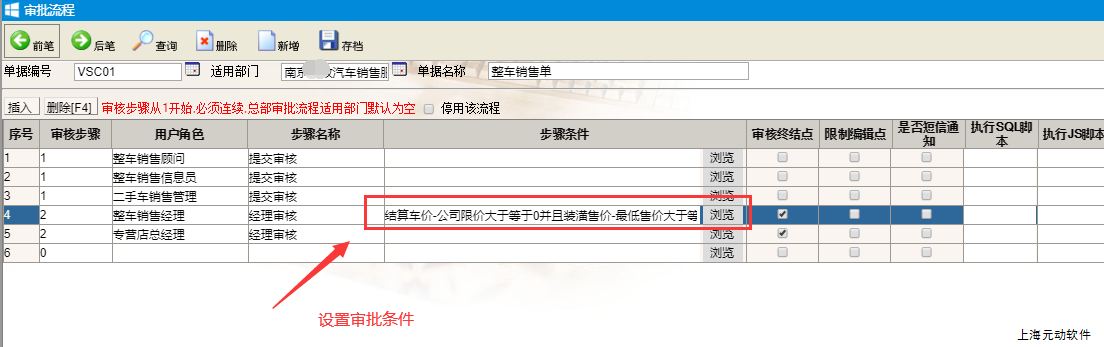 1、在审批流程设计中的整车销售单流程定义的步骤条件中添加装潢金额-装潢最低售价条件来控制审批过程,如下图定义,销售经理岗位设置了两个审批条件,车价不低于限价、装潢不低于最低售价。