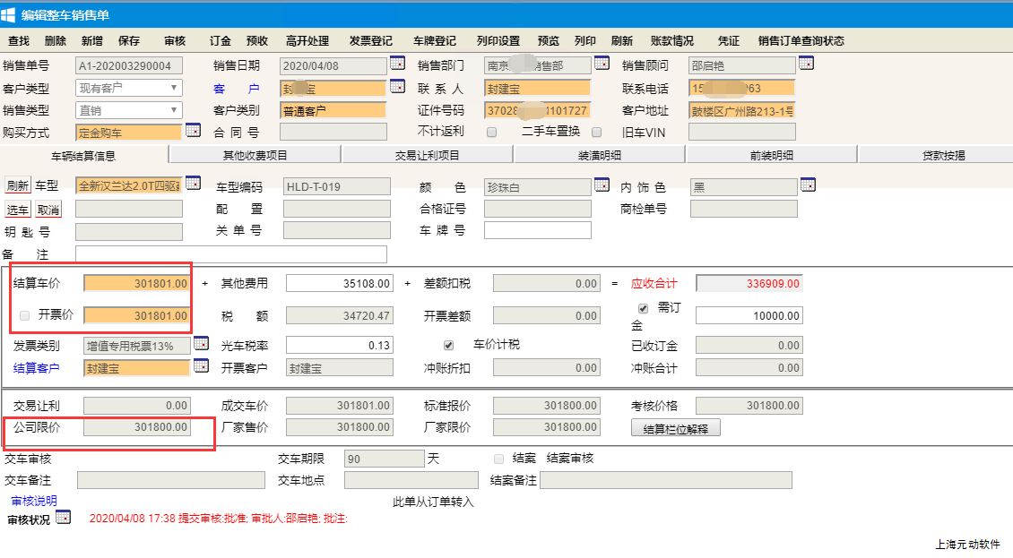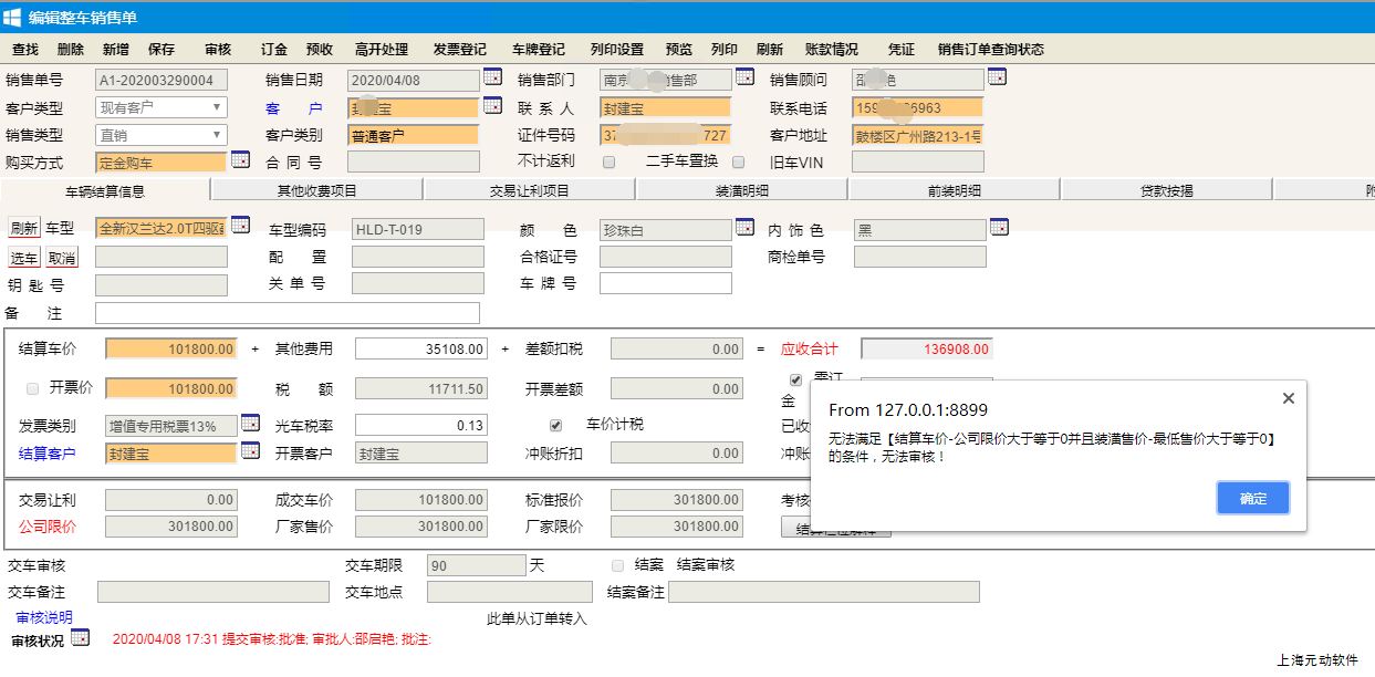 2、情况一销售经理在审核时不满足车价高于公司限价条件时弹出会进行提醒,且审核不了,如下图示。