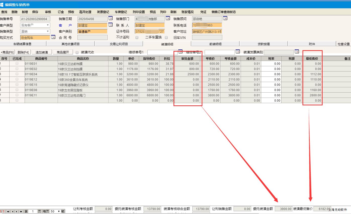 4、整车销售单装潢明细增加了显示最低售价栏,底端显示最低售价合计栏位,通过用户设定中的员工分类【销售经理】来控制显示。