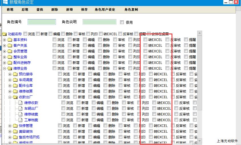 【20160913】之前的版本中,菜单权限“列印”同时控制对应工单的转Excel和打印功能,为避免造成信息外泄的风险。作出修改,统一新增“转Excel”权限单独控制报表查询的转出权限、