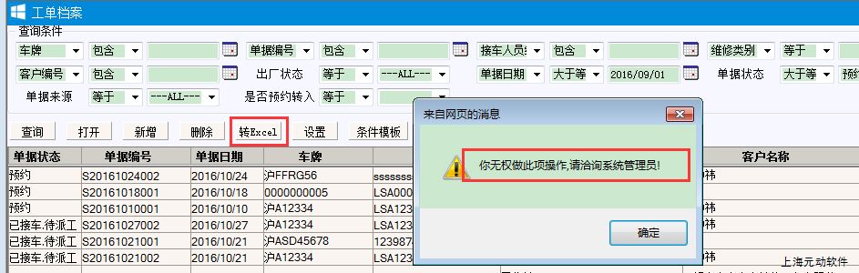 2、当前台接待角色没有给转EXCEL权限时 。会提醒没有权限。