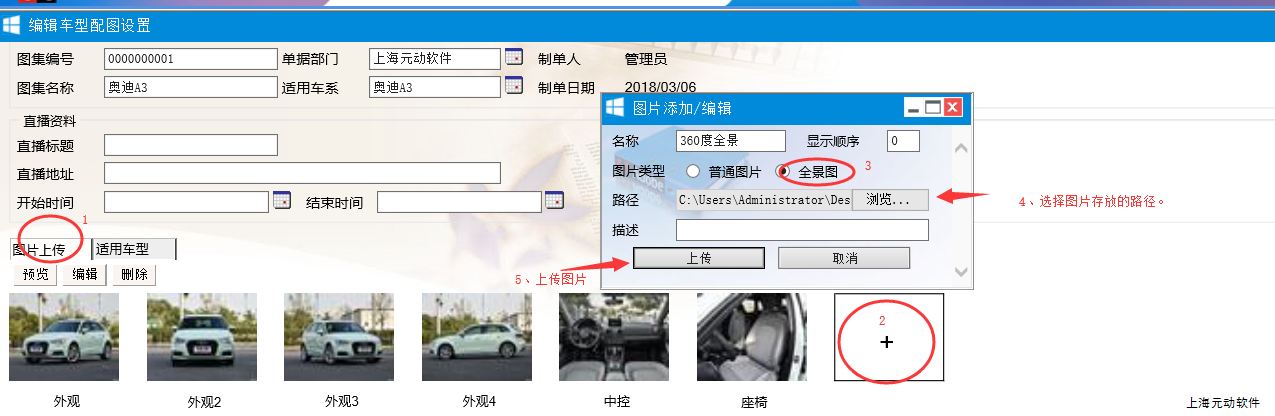 2、选择图片上传、点击图片添加、编辑加载图片,注意此处有两个加载图片方法,如果是普通的图片,先择加载普通图片上传,如果是全景图,选择加载全景图片。此处以全景图为例进行讲解。