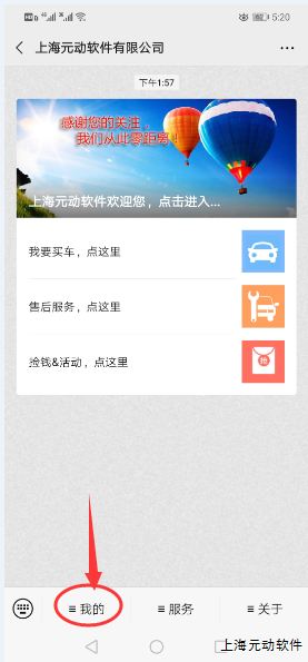 4、手机微信公众号中展示、以上海元动软件微信公众号为例讲解,在微信公众号搜索:上海元动软件 并关注。进入公众号后,点我的,我的主页,新车展厅。