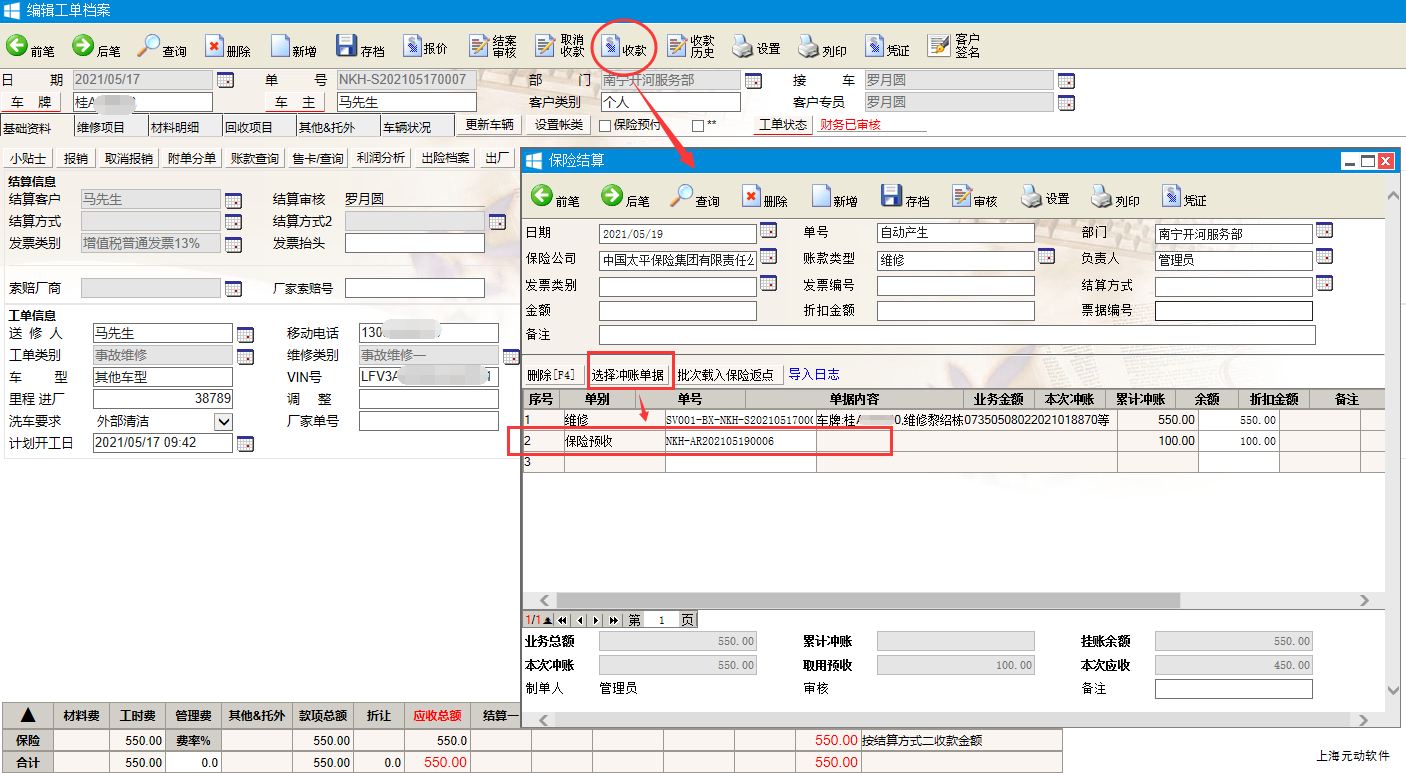 2、核销维修工单的理赔款时点开收款按钮下拉选择【保险结算】即可打开保险结算窗口,点击【选择冲账单据】按钮即可将保险预收单据调用出来进行抵扣处理。