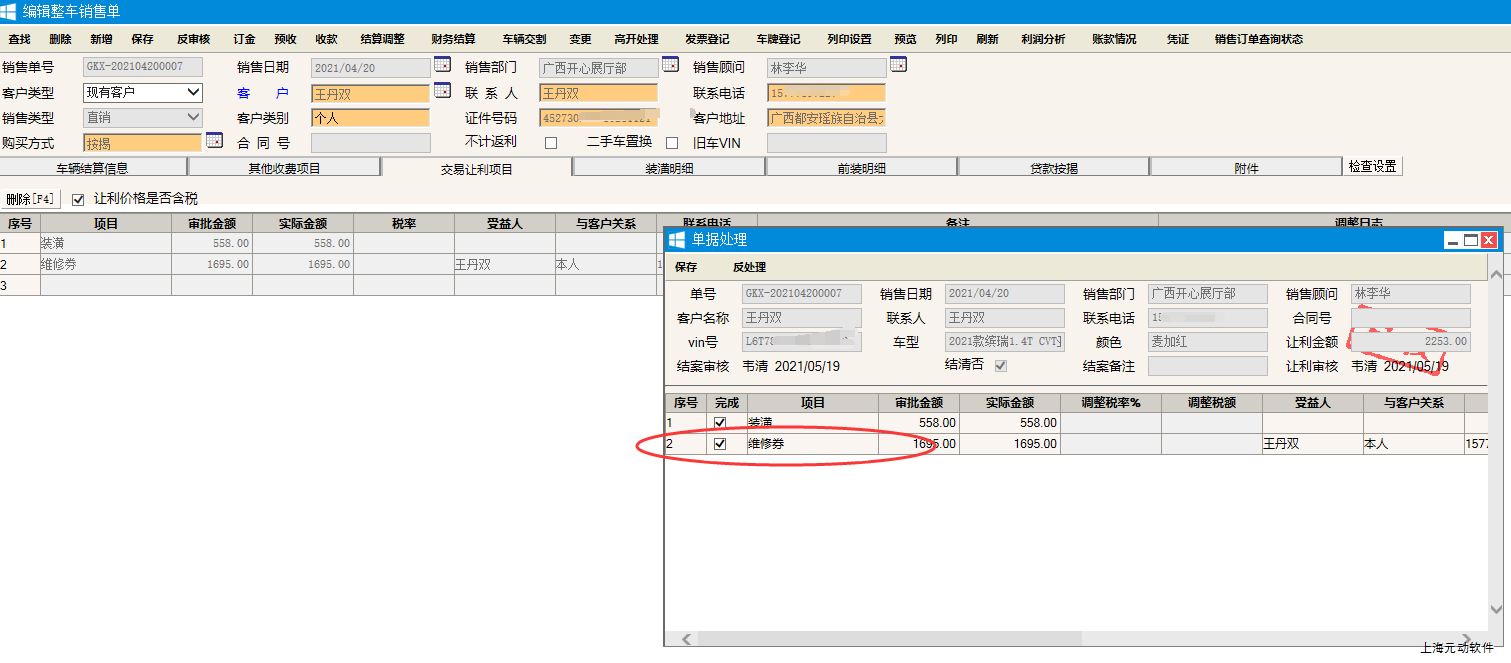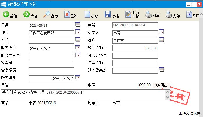 3、产生的客户预收款单据内容如下,自动记录来源销售单号,结算方式自动默认【整车让利预收】,金额为让利处理项目中的金额。