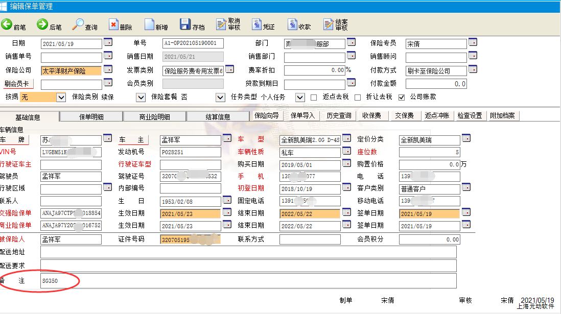 2、保单管理新增保单时系统会判断备注栏位是否为空作为条件,不为空则产生第三方的代付的费用单据。