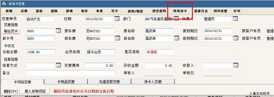 想把会员卡停止使用,如何停用会员卡,在卡变更里面,做个卡变更,在卡变更里面有个停用该卡如图: