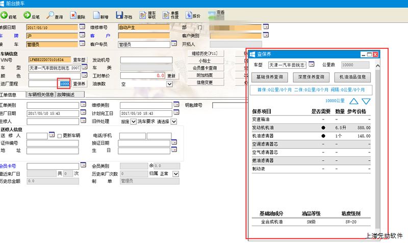 在【进厂里程】栏位输入进厂里程数,然后点击查保养(查询的保养信息会根据不同的里程变更)
