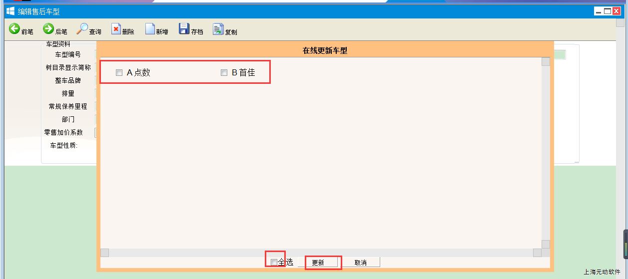1、在售后车型编辑界面。点击“在线更新”弹出更新页面,选择需要更新的品牌,可多选或全选。