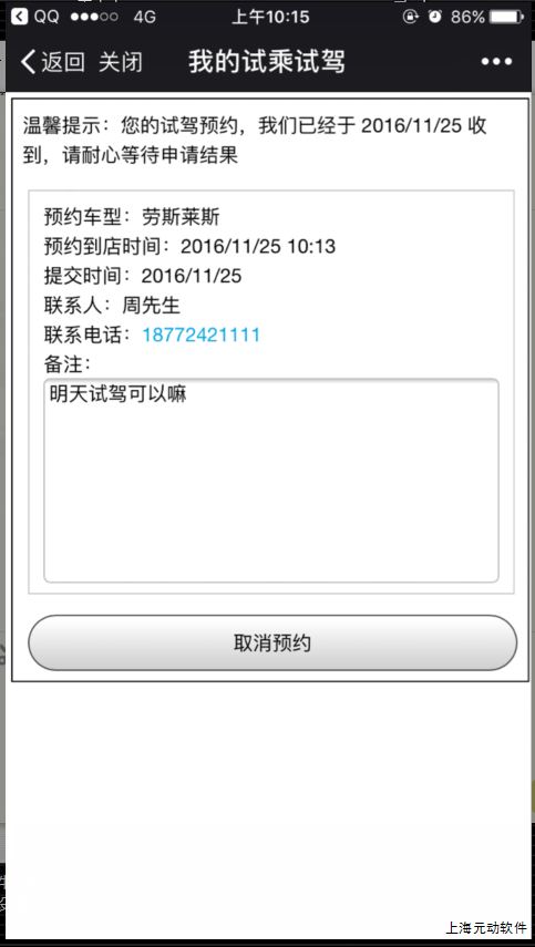 回到【我的主页】,可发现【我的试乘试驾】新增一条记录--点击进去即可查看预约相关信息