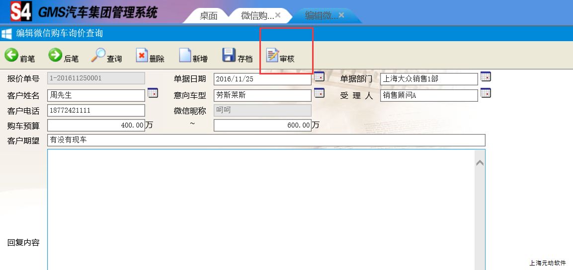 如图进入相关操作目录,找到该客户通过微信提交过来的信息,我们进行回复并审核