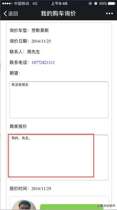 当我们做出回复之后,客户在微信公众号【我的购车询价】页面可看到回复结果。下图为S4处理之后客户微信收到的反馈