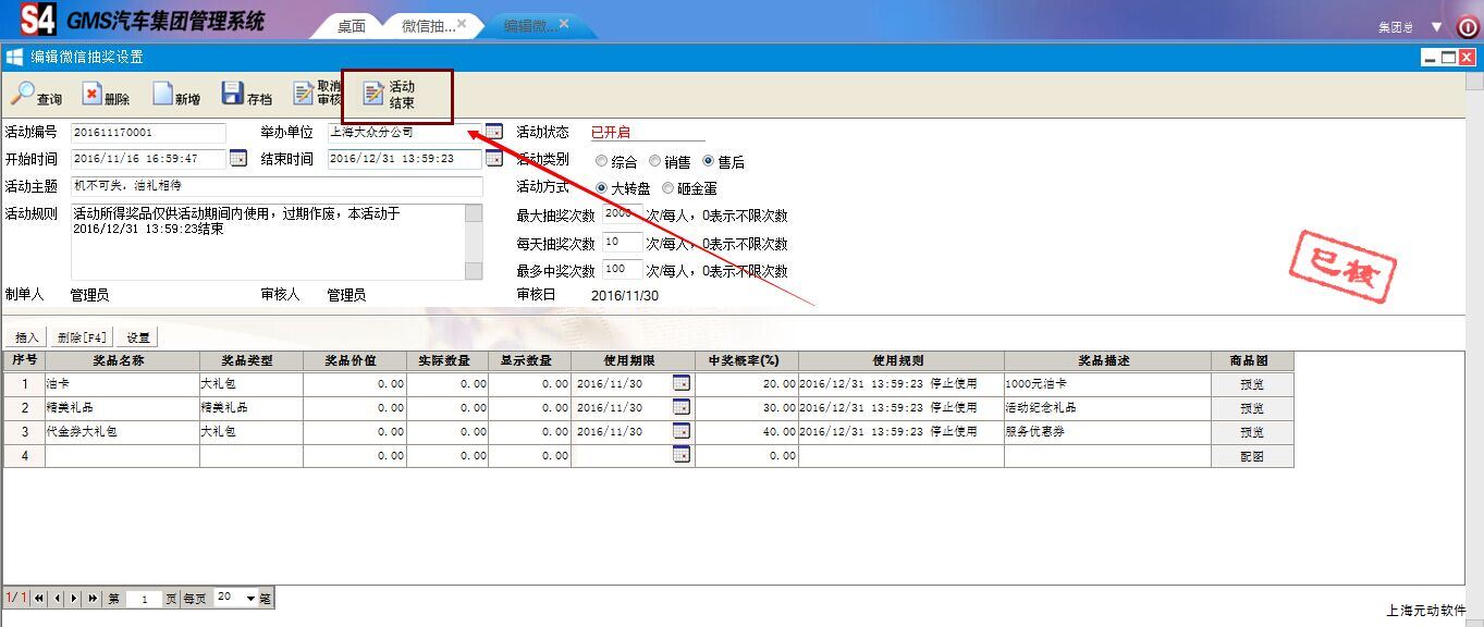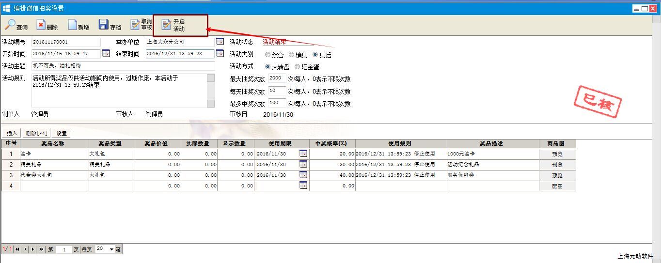 ② 审核完成之后出现开启活动按钮,此处控制活动开启/结束状态