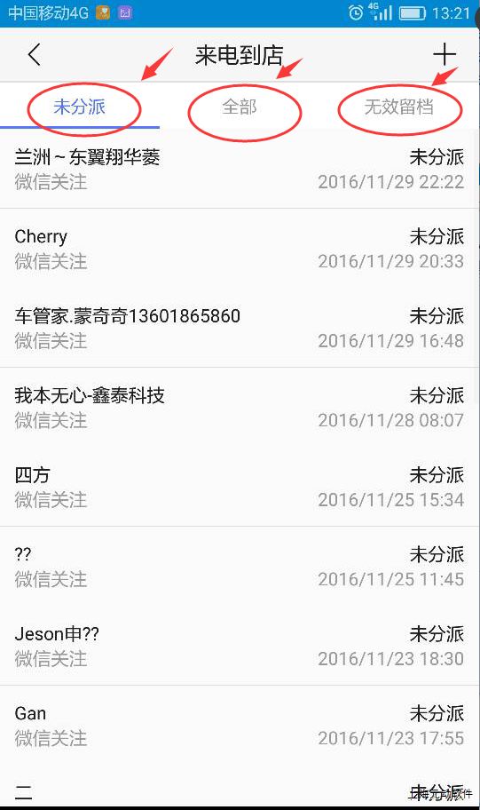 来电到店记录明细当前分为未分派、全部、无效留档三个页面
