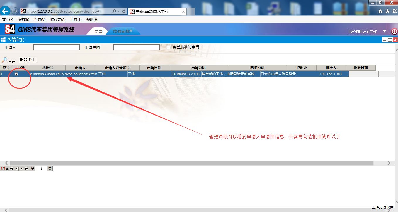4、管理员的帐号是不受限制的,登陆后在审批流程页面可以看到申请登陆元动系统的帐号情况,审批通过后申请人就可以登陆系统了。