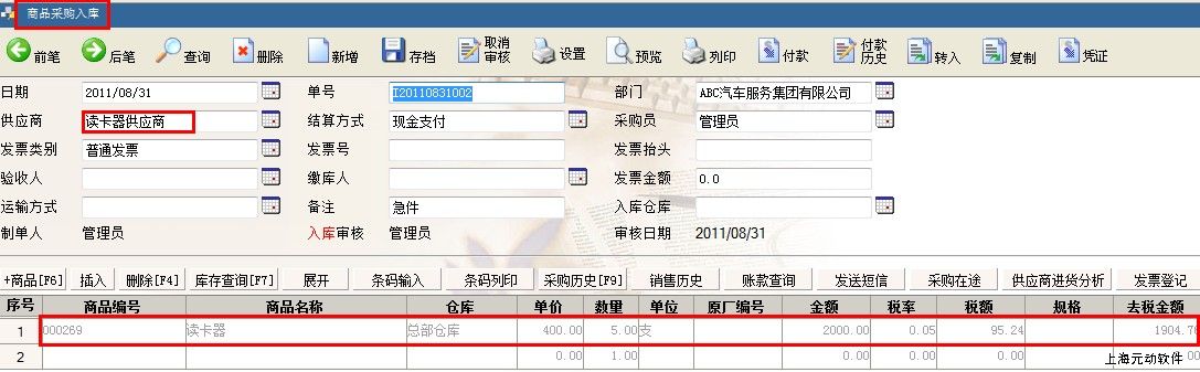 操作完成后,系统会自动产生一张采购入库单;即配件已入库;